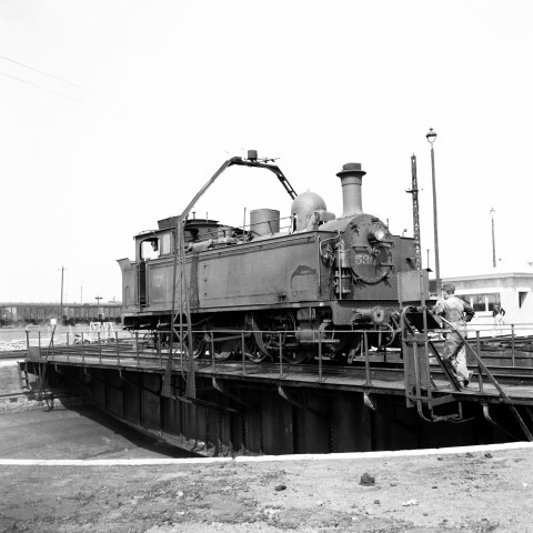 Deze fotogroep bestaat uit twee negatieven. Foto A toont locomotief 10.025 (2C1 Pacific) bij het achterwaarts oprijden van de draaischijf. Haar tender is volgeladen met briketten. Onder de bekolingsinstallatie staat een tenderlocomotief type 53 (Dt). Op foto B staat tenderlocomotief 53.002 op de draaischijf.
