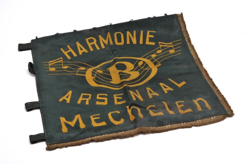 De vlag is groen met gele opschriften: we lezen 'Harmonie Arsenaal Mechelen' met daarbij het logo van de NMBS en een notenbalk. Links bevinden zich vier lussen om de vlag aan een stok te bevestigen. Twee andere zijden zijn omzoomd met een rafelrandje. De vlag is aan beide zijden identiek beschreven.