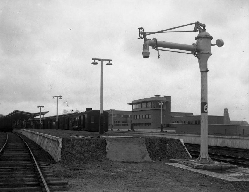 Deze fotogroep bevat drie glasplaten. Ze tonen de waterkolommen op het einde van de perrons in Brugge. Deze geven de mogelijkheid om tijdens de stilstand in het station de stoomlocomotieven te voorzien van water. De perrons zijn gedeeltelijk overdekt met luifels. De elektriciteitspalen zijn met voor die tijd typische armaturen uitgerust. Aan het ene perron zien we een reizigerstrein met aan de staart een M 1-rijtuig met stuurpost. Er staat een bagagekar naast de trein. Op het andere perron staat een trein gesleept door een stoomlocomotief van het type 41 of 44 (C Bourbonnais). Een personeelslid poseert naast de locomotief. In de achtergrond zien we de seinpost van het station Brugge.