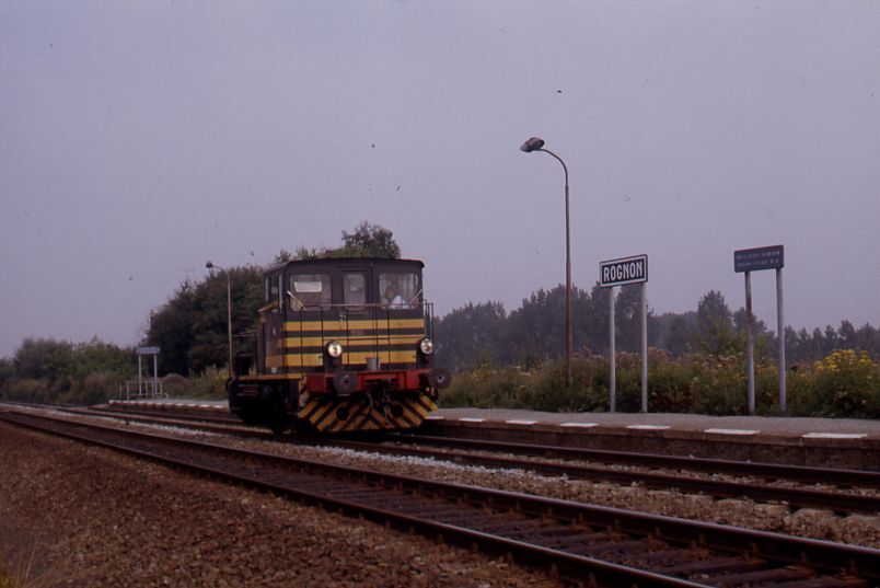 Rangeerlocomotief 9133 wacht op een volgende rangeerbeweging in het station Rognon. Op het perron staan een stationsnaambord, een infobord en een verlichtingspaal. Deze stopplaats ligt langs spoorlijn 115 ('s-Gravenbrakel - Tubeke - Eigenbrakel). Schenking van Myriam Hendrickx.