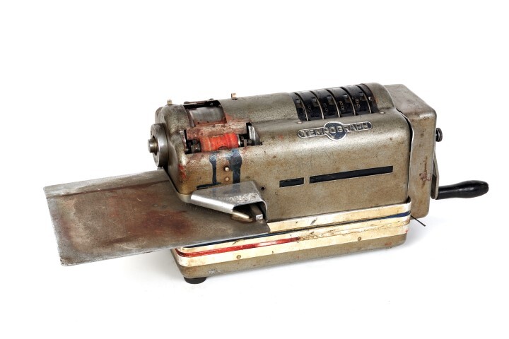 BeschrijvingDe frankeermachine werd gebruikt voor het nummeren van brieven en verzendingsnota's van NMBS-pakjes. Links bevindt zich een metalen plaat om de brieven en nota's op te leggen, recht opzij is een hendel. Bovenaan kan men het nummer aflezen.