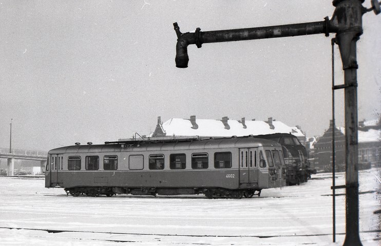 Deze motorwagen behoort tot de reeks 46. Hij staat opgesteld op een van de opstelsporen van de werkplaats. Achter de motorwagen staat een locomotief uit de reeks 62. Op de voorgrond zien we een waterkolom, een restant uit het stoomtijdperk. Schenking van Myriam Hendrickx.