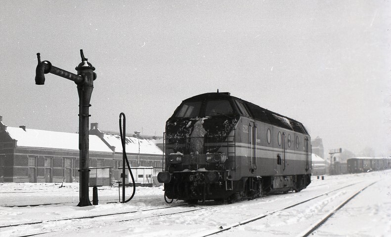 Deze locomotief behoort tot de reeks 62/63. Ze staat opgesteld op een ondergesneeuwd opstelspoor van de werkplaats. De locomotief is groen geschilderd met gele zichtbaarheidsstrepen. Links staat een waterkolom, een restant uit het stoomtijdperk, en daarnaast een dieselpomp. In de achtergrond zien we dienstgebouwen van de werkplaats. Schenking van Myriam Hendrickx.