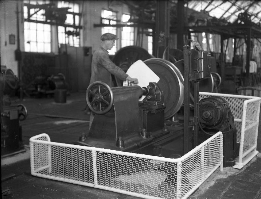 BeschrijvingDeze fotogroep bevat vier glasplaten. Ze tonen een aantal maatregelen die de arbeiders beter moeten afschermen van het aandrijfmechanisme van draaibanken en werktuigmachines.