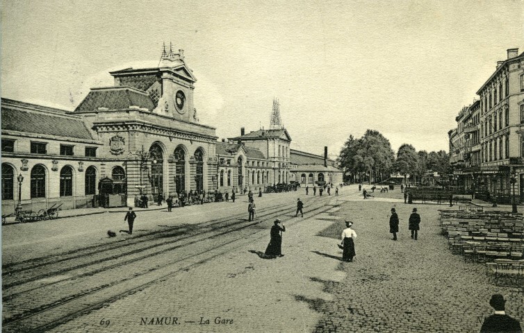Reproductie van een postkaart met als opschrift '69 Namur. - La Gare'. De postkaart toont de voorgevel van het station. Op het stationsplein staan terrasjes uitgestald en lopen voorbijgangers. In het midden van het plein lopen tramsporen. Collectie Jan Verhaeven.
