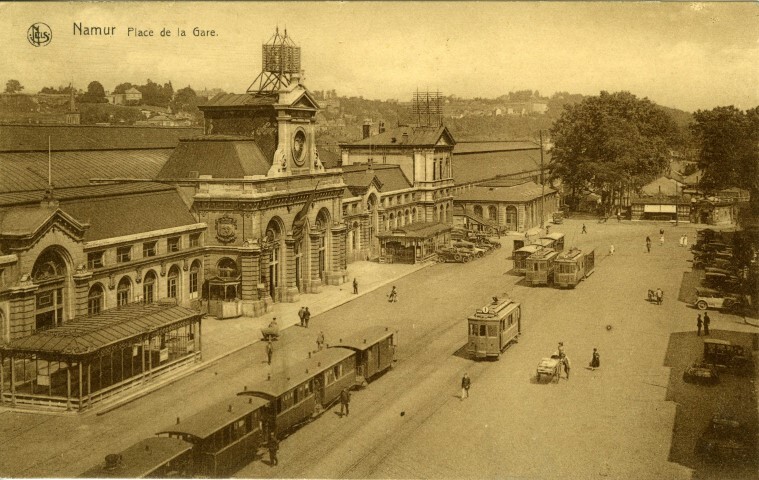 Reproductie van een postkaart met als opschrift 'Namur Place de la Gare' en als uitgever 'Nels'. De postkaart toont de voorgevel van het station in neoklassieke stijl. De ramen en deuren hebben bovenaan een rondboog. De centrale inkomhal wordt bekroond door een ornament met driehoekig fronton. Op het dak staat een telefoon- en telegraafmast. Een overkapping overspant de perrons en sporen. Op het stationsplein verplaatsen voetgangers zich tussen de stadstrams en een sleep rijtuigen van de buurtspoorwegen. Links zien we op het trottoir een wachtlokaal in gietijzer en glas voor de gebruikers van het stads- en streekvervoer. Rechts staan auto's geparkeerd. Collectie Jan Verhaeven.