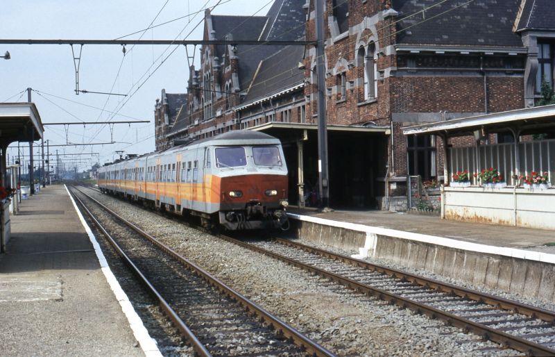 BeschrijvingVierledig motorstel 802 is aangekomen in het station. Rechts staat het stationsgebouw met luifel. Ook de perrons werden duidelijk in beeld gebracht.
