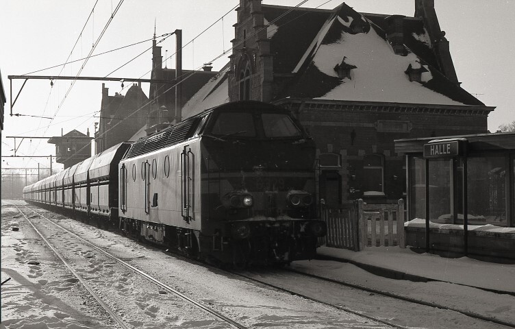 Deze locomotief behoort tot de reeks 63. Ze heeft een homogene goederentrein, bestaande uit tremelwagens, aan de haak. Rechts zien we het stationsgebouw en in de achtergrond de blokpost. Verder zien we uiterst rechts een stationsnaambord op het ondergesneeuwde perron. Schenking van Myriam Hendrickx.