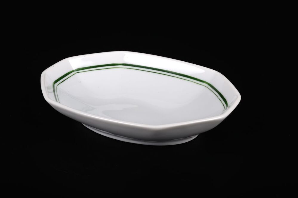 BeschrijvingWit schoteltje met een dubbele groene bies.