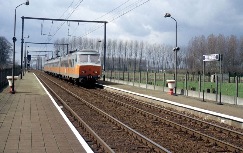 Vierledig motorstel 803 komt aan in het station Beervelde. We hebben zicht op de perrons, een stationsnaambord, bloempotten en verlichtingspalen met luidsprekers. Op het uiteinde van het linkse perron staat een lichtsein. Schenking van Myriam Hendrickx.