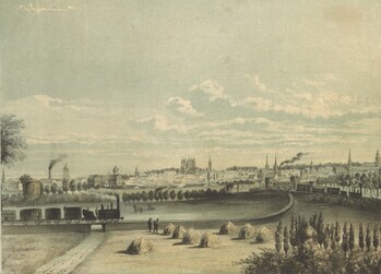 BeschrijvingGekleurd panorama van de stad Doornik. Links vooraan rijdt een stoomtrein in de richting van de stad.