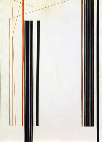 Non-figuratieve compositie van lijnen in wit-zwart met rode accenten