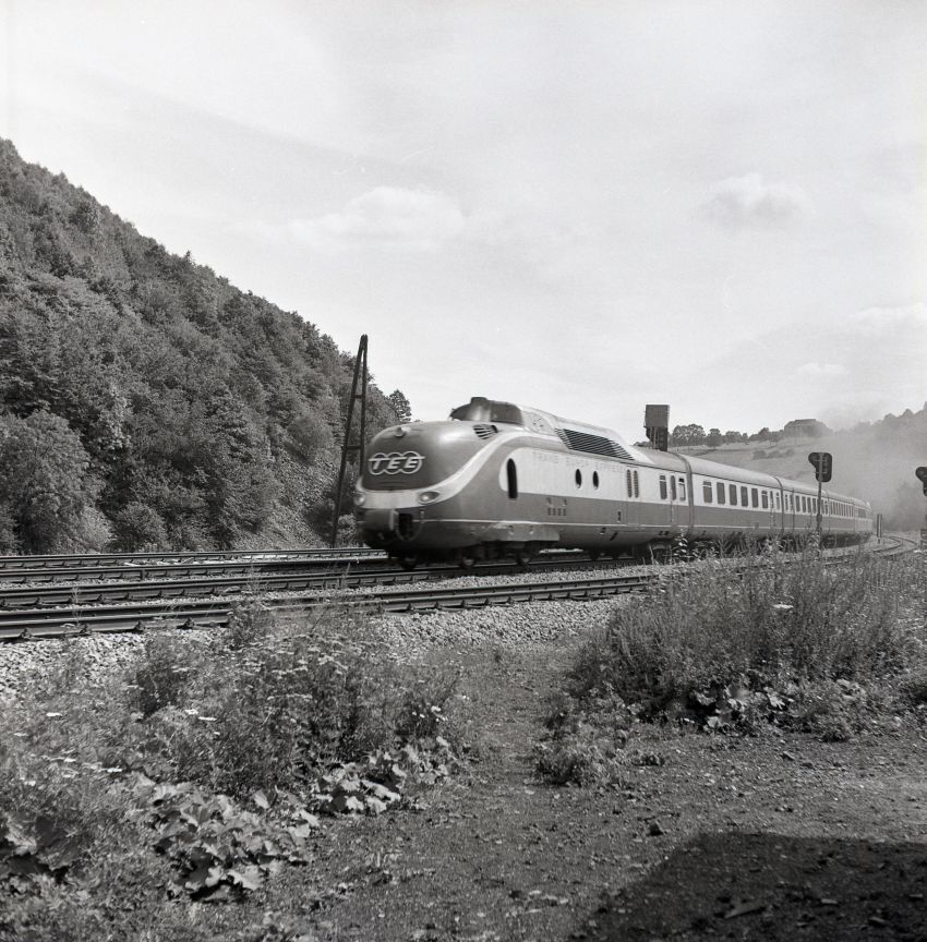 De foto toont een TEE-dieselmotorstel van de Deutsche Bundesbahn (DB) van het type VT 11.5. De trein rijdt nabij Trooz op spoorlijn 37. Op de voorzijde van het koprijtuig staat het TEE-logo. Spoorlijn 37 (Luik-Guillemis - Verviers-Centraal - Hergenrath - Duitse grens) was op dat ogenblik nog niet geëlektrificeerd.