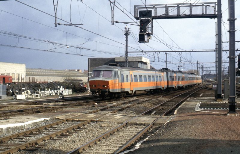 Vierledig motorstel 809 (reeks 08, schijf 1975) komt aan in het station Aarschot. Het is nog geschilderd in de oorspronkelijke oranje/grijze livrei. Op de voorgrond zien we de uiteinden van de perrons. Rechts staat een bovenleidingsportiek met een lichtsein. Schenking van Myriam Hendrickx.