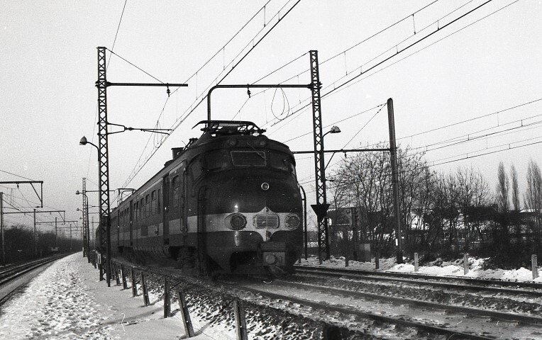 Deze Beneluxtrein bestaat uit motorstel 1203 van de NS aan de staart en motorstel 901 van de NMBS aan de kop. De trein bevindt zich op spoorlijn 25 en rijdt richting Antwerpen. Links zien we de sporen van lijn 27. Bemerk ook de vakwerkbovenleidingspalen langs de lijn 25. Schenking van Myriam Hendrickx.