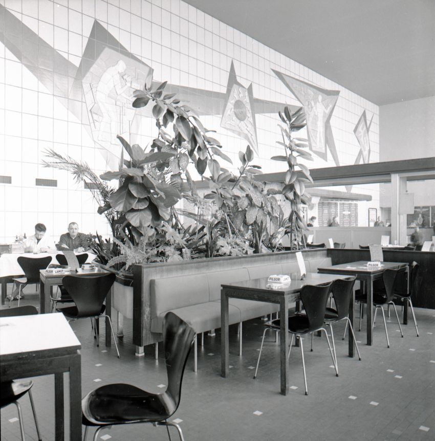 Deze fotogroep bestaat uit twee negatieven. Ze tonen het buffet van het station Mechelen. Tegen de muur zien we een kunstwerk van Lode Eyckermans. Het symboliseert de vooruitgang van de spoorwegen. In de verbruikzaal staan zitbanken en stoelen aan houten tafeltjes.