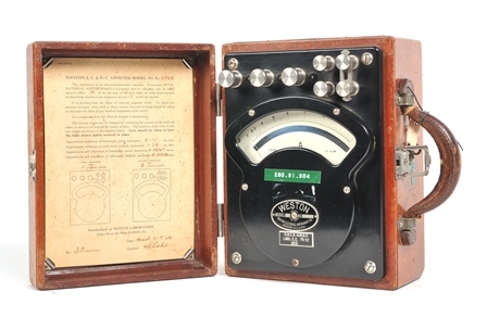 De ampèremeter is een instrument om elektrische stroom te meten. Deze draagbare meter werd gebruikt door de dienst Elektriciteit en Seininrichting. De ampèremeter bevindt zich in een houten kistje en heeft één wijzerplaat die de elektrische stroom kan meten tot 10 ampère. Boven de wijzerplaat zijn zeven aansluitingspunten: 1, 2 en vier keer +/-. Het kistje heeft bovenaan een leren handvat en een sleuteltje.