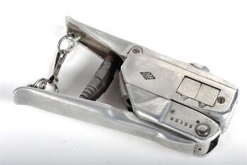 BeschrijvingMetalen tang met een smal gleufje waarin het vervoersbewijs wordt geschoven. Door de benen samen te knijpen wordt een gaatje in het biljet gemaakt en wordt de datum erop gestempeld. Deze tang werd gebruikt door treinbegeleiders.