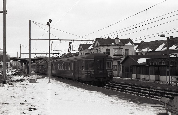Dit motorstel behoort tot de reeks 00, schijf 1963. Het vormt samen met motorstel 665 een reizigerstrein. Het treinstel is groen geschilderd met gele zichtbaarheidsstrepen. De trein bevindt zich aan het besneeuwde perron. Achter de trein zien we het stationsgebouw in neoclassicistische stijl, waar de afbraakwerken al gestart zijn. De luifel op het perron links zal ook afgebroken worden. Op het perron rechts staan twee voorlopige schuilhuisjes. Beide perrons zijn met elektrische verlichtingspalen uitgerust. Schenking van Myriam Hendrickx.