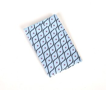 BeschrijvingHet doek is lichtblauw met een patroon van zwarte golvende lijnen en bordeaux streepjes.