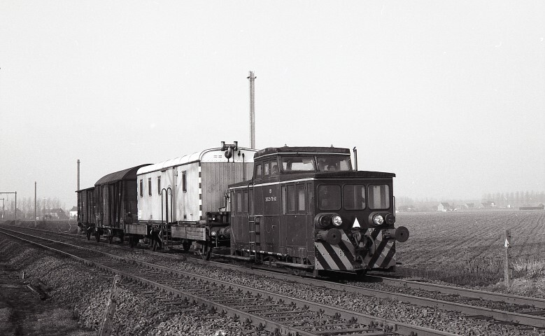 Deze foto toont een werktrein gesleept door een draisine. Deze draisine of baantractor werd gebruikt om arbeiders en materiaal te vervoeren die nodig waren voor het onderhoud van de sporen. Aan de zwart omboorde witte driehoek is te zien dat het om een zwaar dienstvoertuig gaat, dit wil zeggen dat het in staat is om de spoorstroomkringen, de geïsoleerde rails en de railcontacten te doen werken. De draisine is groen geschilderd met gele zichtbaarheidsstrepen. De stuurpost bevindt zich bovenaan in het midden van het voertuig. We zien dat er reeds bovenleidingspalen gemonteerd zijn, een voorteken van de elektrificatie van spoorlijn 90. Schenking van Myriam Hendrickx.