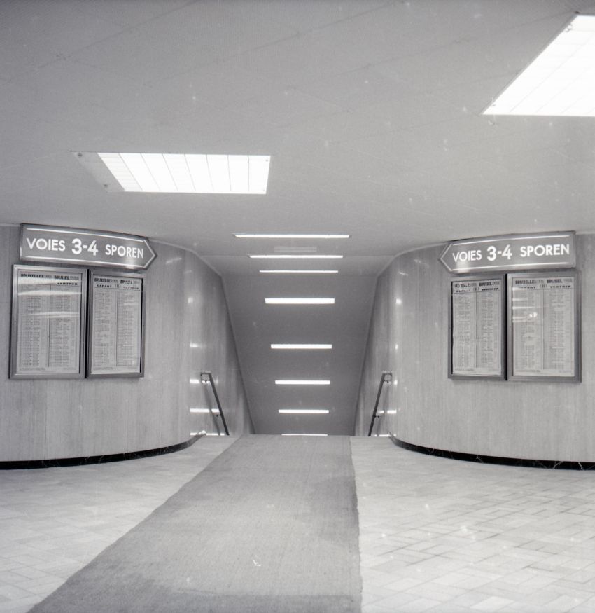 Deze fotogroep bestaat uit 15 negatieven. Ze tonen het interieur van het station Brussel-Centraal. We zien de toegangstrappen naar de sporen en de perrons met mechanische treinaankondigers. Het station beschikt over vaste trappen en over roltrappen om zich naar de perrons te begeven. Brussel-Centraal is een ondergronds station in de Noord-Zuidverbinding. Op foto F zien we een reiziger op het perron van spoor 3, die gaat instappen in de omnibustrein naar Dilbeek van 12.05. In de wandelzone is een verkoopstand van dagbladen aanwezig. In de wachtzone zien we boven de loketten de treinaankondiger met de vertrekkende treinen. Aan de overzijde, bovenaan de centrale trap, bevindt zich het monument voor de herdenking aan de 3012 gesneuvelde spoormannen in de twee Wereldoorlogen.
