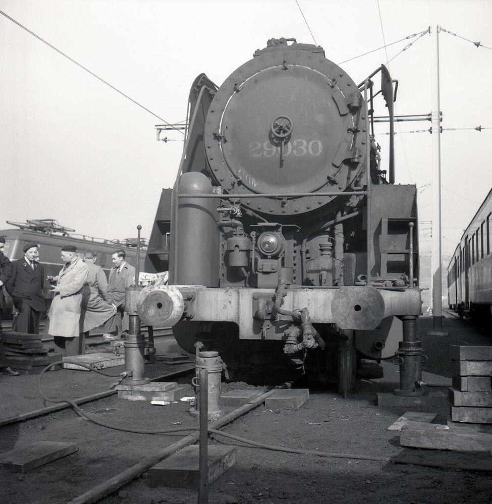 Deze fotogroep bevat vier negatieven. Ze tonen de werkwijze bij het hersporen van stoomlocomotief 29.030. Dergelijke handeling gebeurt in drie stappen: eerst wordt de locomotief omhoog getild door middel van een onder de bufferplaat geplaatste hydraulische krik (foto's A en B). Vervolgens wordt ze, door een tegen een wiel geplaatste hydraulische krik, langzaam zijwaarts geduwd tot wanneer alle wielen zich loodrecht boven de spoorstaven bevinden. Tenslotte laat men de locomotief terug zakken tot wanneer de wielen terug op de sporen komen te staan.