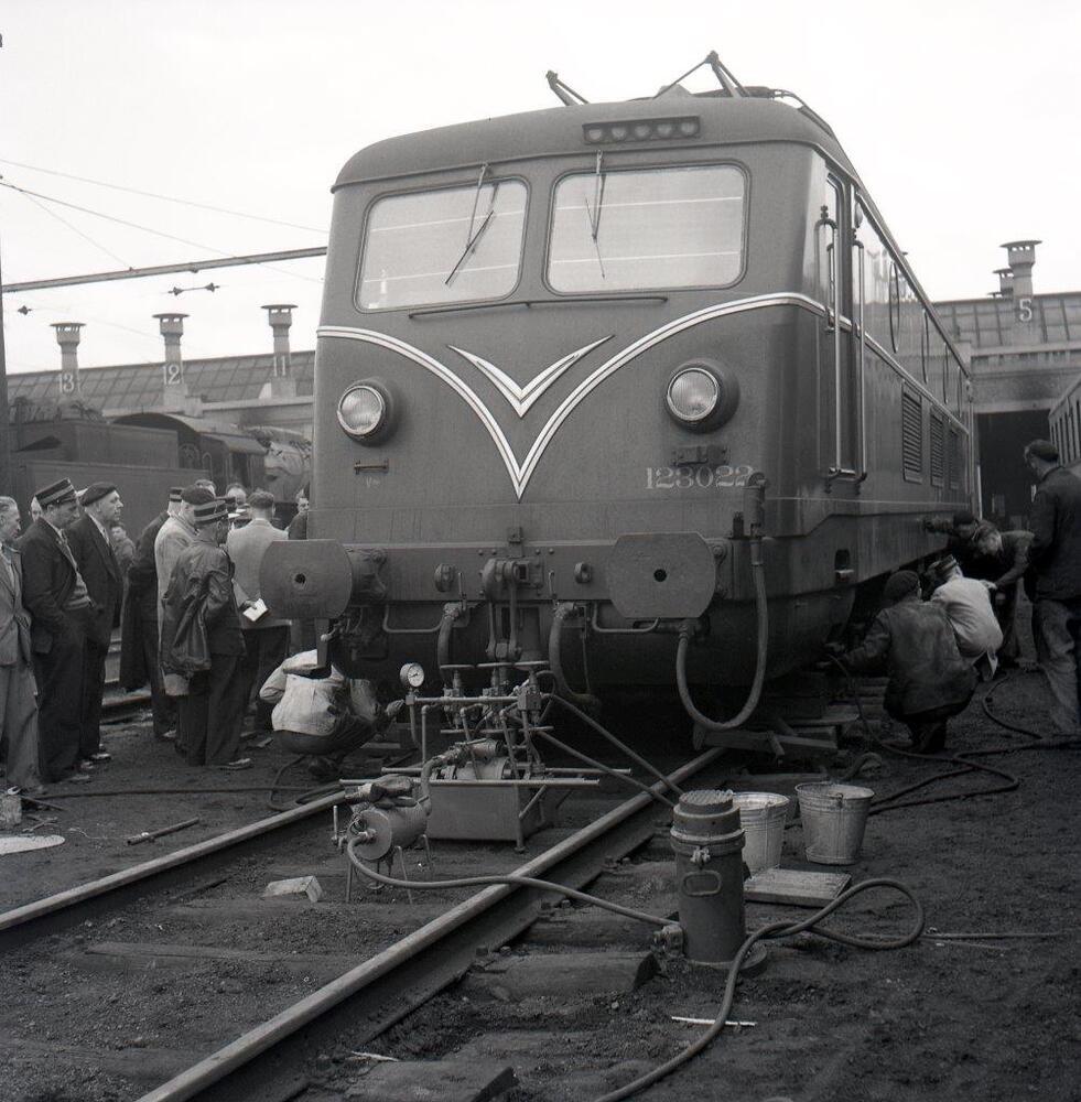 Deze fotogroep bevat drie negatieven. Ze tonen de werkwijze bij het hersporen van elektrische locomotief 123.022 (type 123). Dergelijke handeling gebeurt in drie stappen: eerst wordt de locomotief omhoog getild door middel van een onder het chassis geplaatste hydraulische krik (foto C). Vervolgens wordt ze langzaam zijwaarts geduwd tot wanneer de wielen zich loodrecht boven de spoorstaven bevinden (foto's A en B). Tenslotte laat men de locomotief terug zakken tot wanneer de wielen terug op de sporen komen te staan. De opnames werden gemaakt in de werkplaats van Ronet.