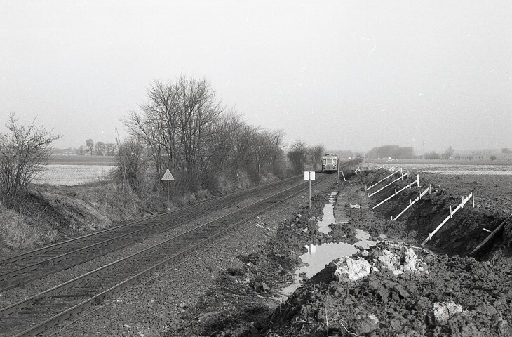 De foto toont vermoedelijk het begin van de werken aan het nieuwe baanvak tussen Mark en Aat van de spoorlijn. Langs de lijn staan twee seinborden: een driehoekig snelheidsbord dat de referentiesnelheid (120 km/u) van de lijn aangeeft, en een rechthoekig bord dat de oorsprong van de snelheidsvermindering toont. In de achtergrond zien we een motorwagen reeks 46. Schenking van Myriam Hendrickx.