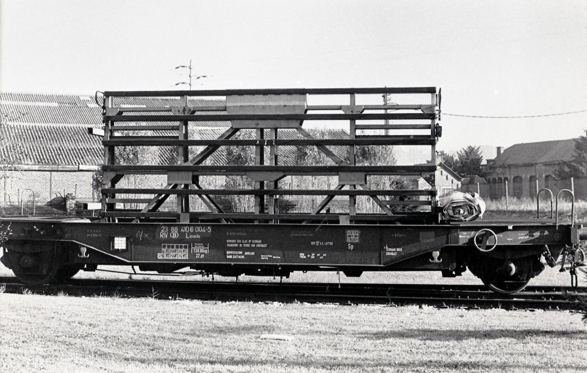 De foto toont een tweeassige schraagwagen voor het vervoer van grote glasplaten. Hij heeft het nummer 23 88 4106 004-5 en behoort tot het type Llmmps. De glasplaat wordt op de schraag vastgemaakt en verankerd en beveiligd tegen beschadigingen.