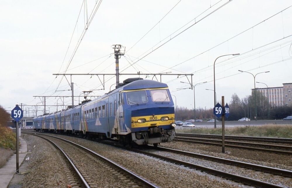 Deze fotogroep bestaat uit vijf dia's. Vierledig motorstel 808 (reeks 08, schijf 1975) heeft net het station Antwerpen-Berchem verlaten. aan de borden naast het spoor te zien is duidelijk dat we ons op spoorlijn 59 bevinden. De volgende foto is genomen even verderop in dezelfde omgeving.Het treinstel is beschilderd met reclame voor de commerciële omroep VTM. Schenking van Myriam Hendrickx.