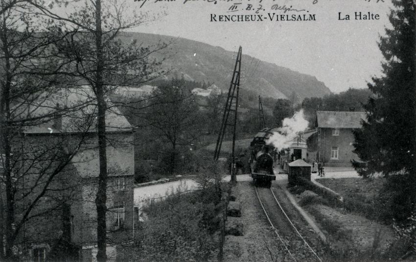Reproductie van een postkaart met als opschrift 'Rencheux-Vielsalm La Halte'. De postkaart toont een stoomtrein, vermoedelijk gesleept door een stoomlocomotief type 44 (C Bourbonnais), die voorbij een overweg rijdt, naast de spoorweghalte Rencheux. Deze halte lag langs spoorlijn 42 (Rivage - Gouvy - Luxemburgse grens). Naast de spoorlijn staan telefoon- en telegraafpalen.