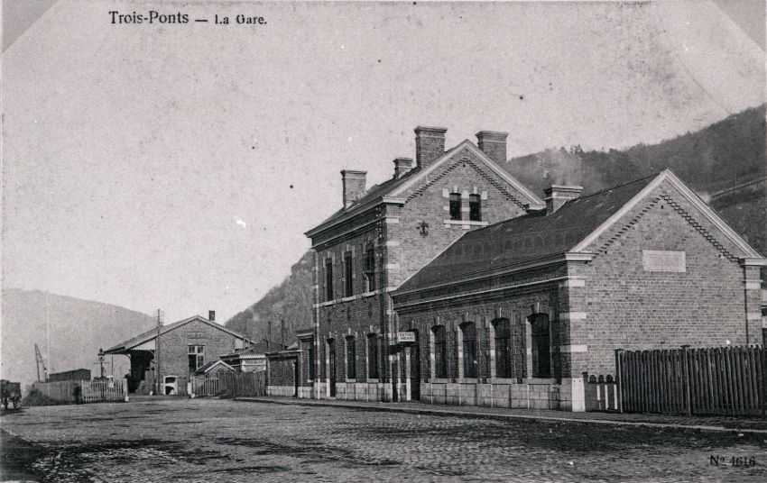 Reproductie van een postkaart met als opschrift 'Trois-Ponts - La Gare.' en 'N°4616'. De postkaart toont het stationsgebouw langs de straatkant. Daarachter is de goederenloods duidelijk zichtbaar. Station Trois-Ponts bevindt zich op spoorlijn 42 (Rivage - Gouvy - Luxemburgse grens).
