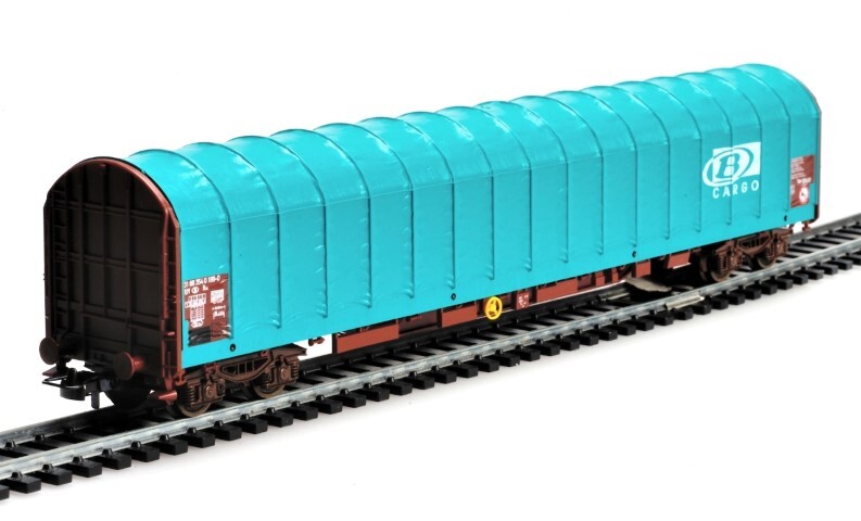 BeschrijvingBruine platte wagen op draaistellen van het type Rils met groene huif. Aan beide zijkanten staat het logo van B-Cargo. De maquette is op schaal H0 1/87 vervaardigd.