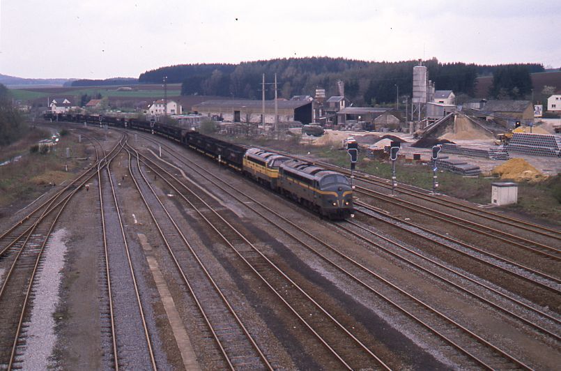 Deze fotogroep bestaat uit twee dia's. Twee diesellocomotieven reeks 53 slepen samen een ertstrein, bestaande uit tremelwagens, door de bundel van het station. De eerste locomotief is groen geschilderd met een gele sierstreep. De tweede is met een vlottende cabine uitgerust. Ze heeft een gele livrei met brede groene banden. Rechts zien we enkele lichtseinen. Schenking van Myriam Hendrickx.