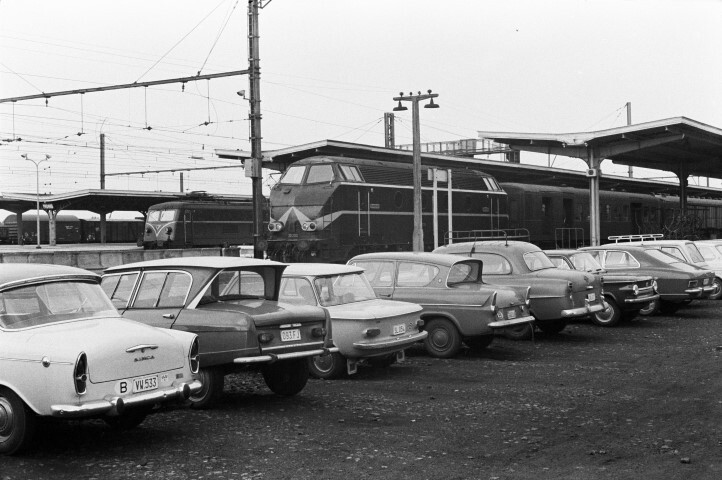 Deze fotogroep bestaat uit drie negatieven. Ze tonen de parking voor auto's in het station Bergen. Aan de perrons staan gesloten goederenwagens, een elektrische locomotief type 140 en diesellocomotief 212.200 met een sleep M 1-rijtuigen opgesteld. De perrons zijn met luifels, stationsnaamborden en elektrische verlichting uitgerust.