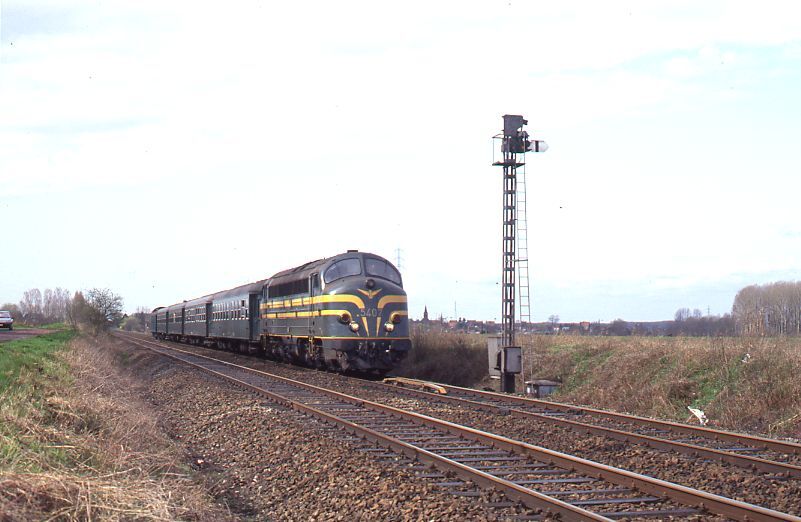 Deze fotogroep bestaat uit acht dia's. Diesellocomotief 5407 (reeks 54) sleept een reizigerstrein samengesteld uit K 3-rijtuigen. De trein staat ter hoogte van een mechanisch sein. Op de laatste foto rijdt er een andere reizigerstrein met M 2-rijtuigen voorbij op het andere spoor. Schenking van Myriam Hendrickx.