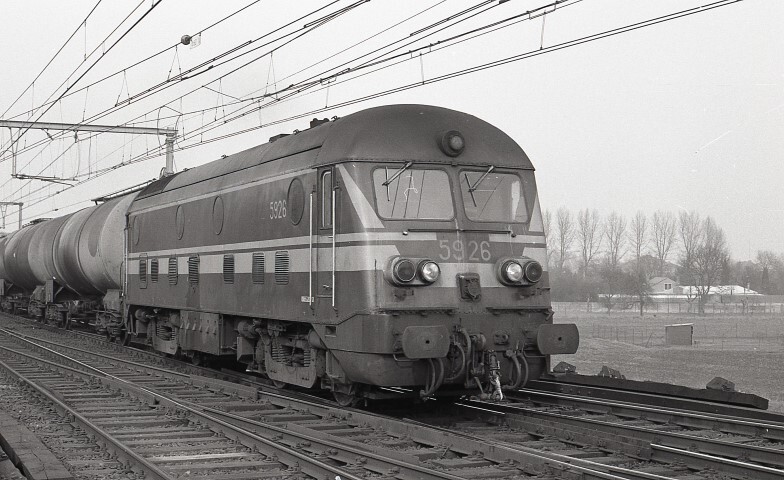 BeschrijvingDeze locomotief behoort tot de reeks 59. Ze heeft ketelwagens aan de haak. De trein bevindt zich op de vertakking van de spoorlijnen 53 en 35.