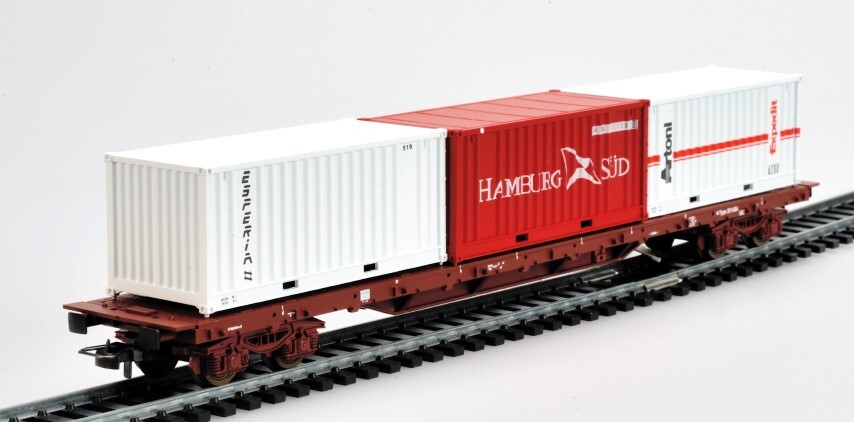Bij deze platte wagen met lettercode Rs horen drie containers: een witte met een Aziatisch opschrift, een rode van Hamburg Süd en een witte van Artoni Expedit. Op de zijkanten van de wagen staan verschillende opschriften, zoals het wagennummer 11 88 390 4 579-6 en het typenummer. De maquette is op schaal H0 1/87 vervaardigd.