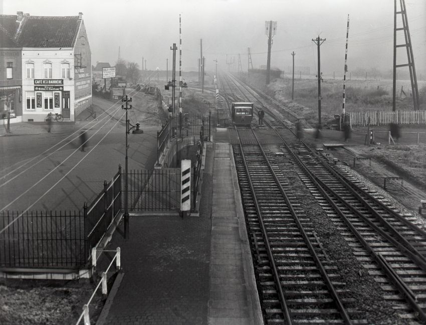 Deze fotogroep bevat twee glasplaten. Ze tonen spoorlijn 124 ter hoogte van het station Eigenbrakel. De lijn is nog niet geëlektrificeerd. De overweg wordt bewaakt en kan afgesloten worden door slagbomen. Op het linkerspoor zien we voor de overweg een draisine die stilstaat. Een aantal mensen steken de sporen over aan de openstaande overweg. Op de voorgrond bemerken we een baken met vier strepen. Dit geeft de afstand aan ten opzichte van het eerstvolgende waarschuwingssein, waarbij elke streep telt voor 50 meter. Verder in de achtergrond nemen we het betrokken sein waar. Let ook op de typische telefoon- en telegraafpalen. Naast de sporen lopen de trekdraden voor de bediening van seinen en wissels.