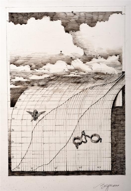Deze zwart-wit afbeelding toont een grafiek die bovenaan verdwijnt in een wolkenpartij. Op de grafiek staan een paar handboeien en een gevleugeld wiel, symbool van de spoorwegen, afgebeeld. De grafiek verwijst naar het toenemende aantal verliezen aan materieel en personeel bij de NMBS vanaf mei 1940 tot juni 1944. De wolken symboliseren het toenemende oorlogsgeweld.