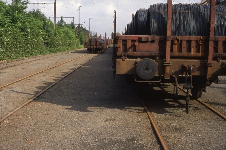 Deze platte wagens met rongen, beladen met rollen staaldraad, staan opgesteld in een vorming van Gentbrugge. De wagen op de voorgrond heeft twee assen. Links zien we de verhoogde lijn 59 (Gent-Sint-Pieters – Sint-Niklaas – Antwerpen-Centraal). De staaldraad was afkomstig van de toenmalige staalfabriek 'ARBED' in Gentbrugge.