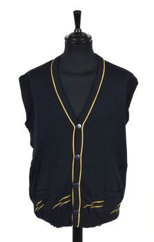 BeschrijvingDonkerblauw wollen gilet met een V-hals, gele biezen en geel motief onderaan. Het wordt gesloten met vier ronde knopen waarop het logo van Eurostar staat. Vooraan zijn twee steekzakjes. Dit gilet werd gedragen door mannelijk personeel van Eurostar.