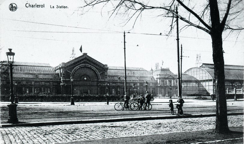 Reproductie van een postkaart met als opschrift 'Charleroi La Station.' en als uitgever 'Nels'. De postkaart toont het station langs de straatkant. Rechts zien we de grote sporenhal in staal en glas. Enkele kinderen en fietsers poseren voor de fotograaf.