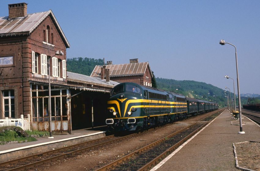 Deze fotogroep bevat 12 dia's. Een reizigerstrein, gesleept door twee diesellocomotieven van de reeks 54, werd tijdens een speciale rit gefotografeerd in station Heer-Agimont. De locomotieven zijn groen geschilderd met gele zichtbaarheidsstrepen. Ze dragen hun oorspronkelijke nummering van vóór 1971.We zien de trein samengesteld uit I 1-rijtuigen aan het perron voor het stationsgebouw. De eerste diesellocomotief wordt afgekoppeld en vervolgens op het spoor naast de andere locomotief opgesteld. Rechts in de goederenbundel staan platte wagens met rongen. Dit station ligt langs spoorlijn 154 (Namen - Franse grens). Het station is met een luifel uitgerust. Op de perrons staan bloemvazen en elektrische verlichtingspalen. Schenking van Myriam Hendrickx.
