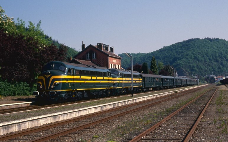 Deze fotogroep bevat 11 dia's. Ze werden genomen tijdens een speciale rit van een reizigerstrein in de omgeving van en in station Hastière. De speciale trein wordt gesleept door twee diesellocomotieven van de reeks 54, met oude nummering daterend van voor 1971. De trein staat aan het perron voor het stationsgebouw. Vervolgens is de trein gefotografeerd op de lijn in de buurt. Station Hastière ligt langs spoorlijn 154 (Namen - Franse grens). Schenking van Myriam Hendrickx.