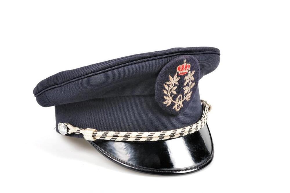 Donkerblauwe dienstpet met een zwarte klep in kunststof. Boven de klep is een dubbele koord in zilver en zwart, bevestigd met twee zilverkleurige knopen waarop een leeuw is afgebeeld. Vooraan is een geborduurd embleem bevestigd. De pet is verstevigd met een leren band en de voering is wit.