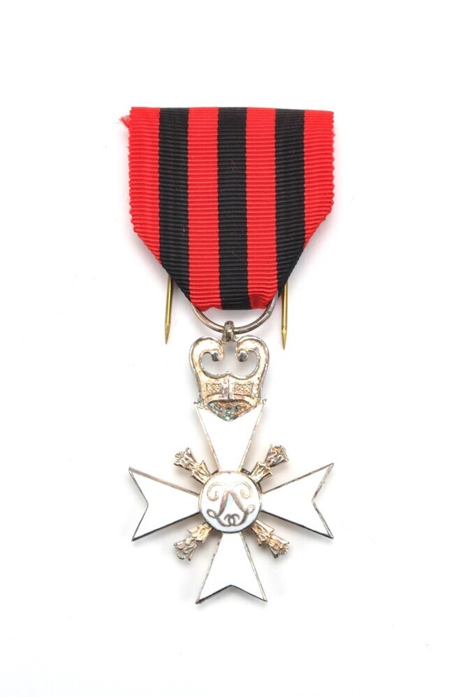 Wit achtpuntig kruis met plantenstengels tussen de punten. In het medaillon staan zowel aan de beeld- als keerzijde het koninklijk monogram 'LL'. Het kruis hangt aan een rood lint met drie zwarte verticale balken. Dit ereteken werd toegekend aan ambtenaren na minimum 25 jaar dienst.