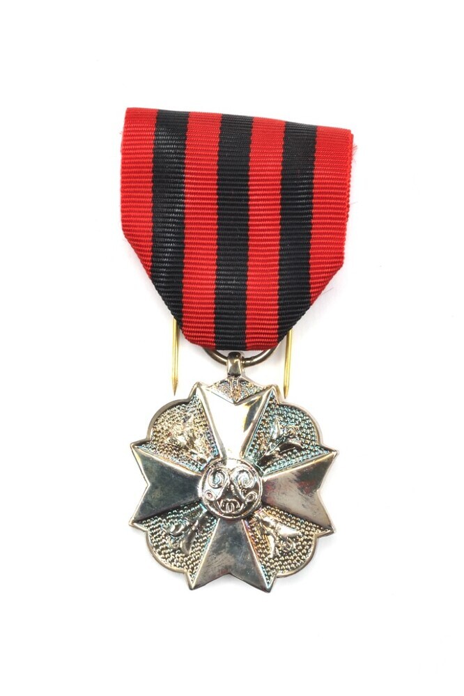 Zilverkleurig achthoekig Maltezerkruis op een kruis van Bourgondië. Plantenstengels tussen de punten. In het midden het koninklijk monogram 'LL'. De medaille hangt aan een rood lint met drie zwarte strepen. Dit ereteken werd toegekend aan spoormedewerkers na 25 jaar dienst.