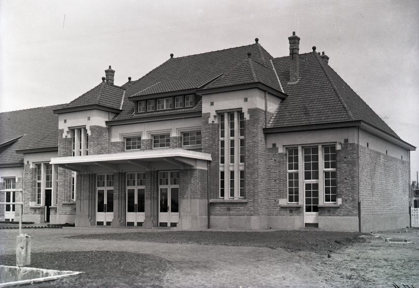 Deze fotogroep bestaat uit drie glasplaten. Ze tonen het stationsgebouw in art deco stijl van Knokke aan de straatzijde en aan de binnenplaats. Foto B toont de wachtruimte waarin een aantal zitbanken zijn geplaatst. De wachtruimte is opgebouwd uit bakstenen en glas. Aan het plafond bemerken we het houten latwerk. In mei 1940 werd het hoofdgebouw zwaar beschadigd en in 1944 opgeblazen.